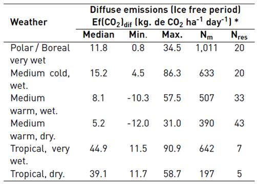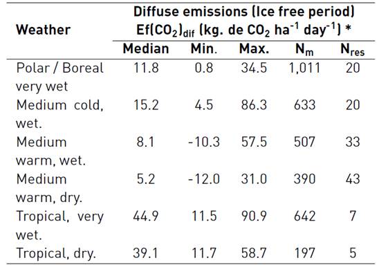 Ef (CO2)dif = Daily average of diffuse emissions from the air-water interface during the ice-free period, kg CO2 ha-1 day-1.