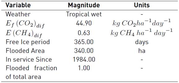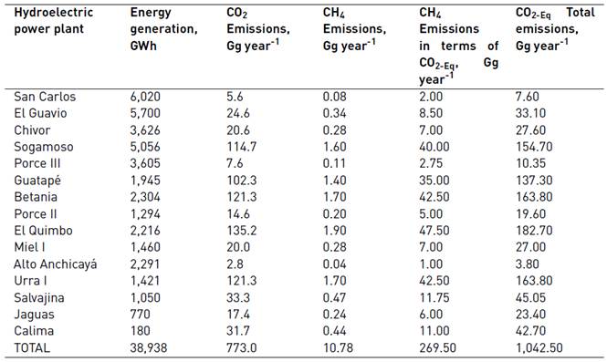 The data for the water reservoir in San Carlos hydroelectric power plant was obtained [Table 6]. This input data was required for the calculation of GHG diffuse emissions. Carbon dioxide and methane were calculated for the main hydroelectric power plants in Colombia using this approach, only the calculation for San Carlos plant was documented as a detailed example, but the results are presented for all the plants involved in this research [Table 7].