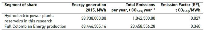 The methodology described by IPCC (2006) was implemented to calculate the GHG diffuse emissions from the hydroelectric power plants water reservoirs in Colombia. This calculation allowed the comparison of the GHG emissions from this energy source available in great quantities along the country of Colombia against other types of energy. The share of use of this energy source was more of 50 % in the year 2015. The emission associated with this anthropological activity was estimated as 1,042,500.00 t CO2-Eq year-1. The impact of energy generation is lower than other energy production alternatives, where fossil fuels or mass burning are the technological basis. The Emission Factor (EF) was estimated for hydroelectric energy generation as 0.027 t CO2-Eq/MWh. The results obtained show that flooding is an important source of GHG emissions to the atmosphere. The local effects in public health must be studied in detail in further works. Local communities not only will be exposed to higher GHG level when new projects of hydropower generation begin, but also the vital water resource for local communities will be affected.
