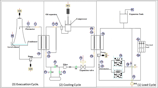 Its operation is based on the pumping of icy water to the spaces to be cooled by using terminal units (for example, fan-coil and thermal floors) for the heat transfer between the air of the spaces and the frozen water. This secondary cooling system operates at night or early in the morning and produces the amount of ice (thermal reservoir) that is required to supply a cooling load at peak times. The cooling system consists of three cycles: evacuation (3), cooling (2), and load (1). Figure 1 shows the devices and sensors distribution for the temperature, pressure, flow and level measurement and recording. The sensors are represented by a circle with a letter, which represents the measurement variable, and a number, which indicates the sensor number.