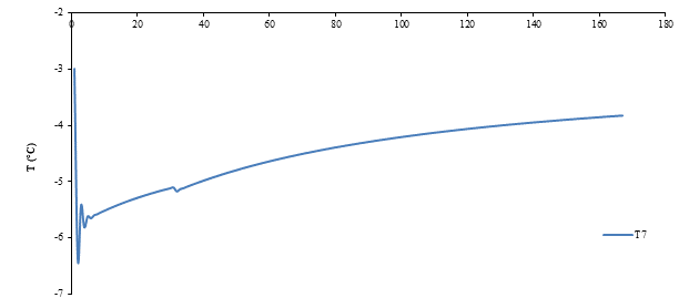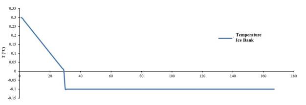 In the Night Mode simulation, the system behaviour during ice generation was emulated. As initial conditions, the banks water temperature was already 0.3 °C because we wanted to analyse the moment at which they begin to freeze the water deposits without assuming that the simulation would have the required time. The initial glycol temperature was -3 °C. The variables observed during this scenario were the evaporator temperature (T7), the glycol pump operation frequency and the ice banks temperature (T9); these elements are located in the Load Cycle.