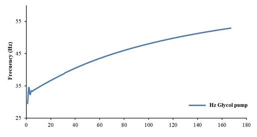 In the same way the glycol pump operation frequency variation is shown during the same operating time (simulation) in Figure 12. It is observed that to maintain the glycol temperature at the evaporator outlet, the control action must increase the glycol flow rate in the cycle.