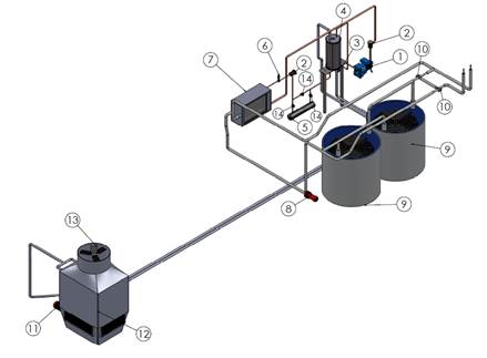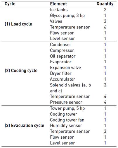 In the load cycle (1), the heat is extracted from the room to be cooled using a mixture of water and glycol, which flows through a piping circuit. The cooling cycle (2) is a vapour compression refrigeration cycle, which employs refrigerant R22 to extract the absorbed heat in the load cycle. The evacuation cycle (3) evacuates the heat transmitted from the condenser to the water that circulates. In Figure 2, the refrigeration equipment is shown; its components are detailed in Table 1.