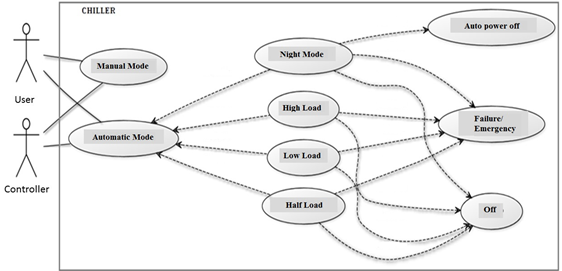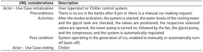 The system considers two main operation modes: manual and automatic. Manual mode activities are managed by an operator, whereas the automatic mode poses a self-regulated operation with minimal human intervention. Auto mode comprises four sub-modes: Low Charge Mode, Medium Charge Mode, High Charge Mode, and Night Mode. The low, medium and high modes are configured according to the cooling load demanded by the area to be conditioned. These three modes primarily vary by how they fill the cooling load. The charge in the night mode is a function of the ice banks production. Due to space limitations, a special description in night mode is provided. A UML diagram of the use cases was constructed; refer to Figure 3 and its description in Figure 3 and Table 2.