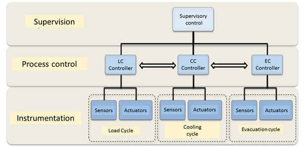 The control system architecture established a distributed process management in three autonomous control elements (controllers) according to the chiller cycles. In addition, it was considered to be a supervisor to coordinate the autonomous controllers; the proposed structure is shown in Figure 4.