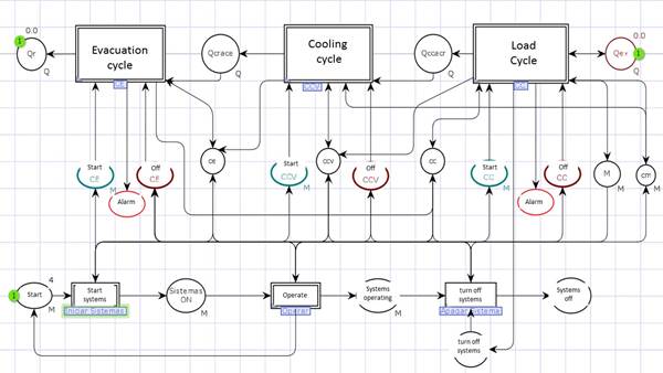 Double-line transitions are a high-level model abstraction: Load, Cooling and Evacuation cycles. A detailed representation of these transitions integrates both the simulation and the operation models of each cycle. Considering the space limitations, only the Evacuation cycle model and some of its components are presented.