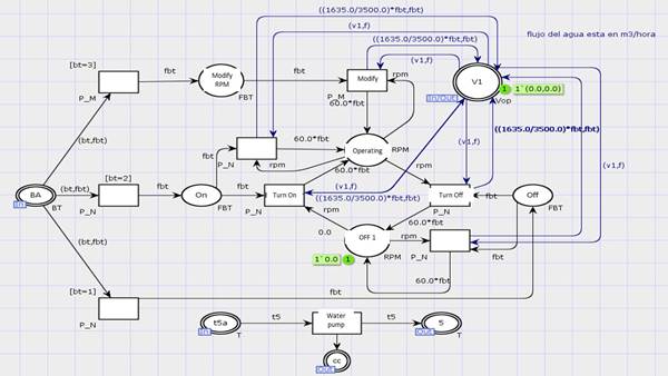 The pump model is presented in Figure 8; this model represents the pump behaviour and its speed variator. It is composed of transitions and places and double-line places, where the blue labels "in", "out" or "in/out", represent ports that interact with elements outside of the pump, such as the location "V1", which represents the flow recorded by the flow sensor in this cycle. The "BA" location represents a load cycle controller order (C-CC), after which the order is classified as an order to modify the pump operating frequency, whose representation is in a place with the same name, or as an order to turn on the pump-place "On"-or a command to turn off the pump-"Off" place. In the middle, the running ("Operating") and off ("OFF") locations represent the pump state. In this case, when it is off, it registers 0.0 rpm, which is the value in green, and when the pump does not operate, the flow through the registered cycle by sensor V1 is 0.0 m3/h and frequency 0 Hz. The modify ("Modify"), shut down (“Turn off”) and power ("Turn On") transitions represent the action execution denoted by its name. Additional transitions to the centre, without a name, emulate other action executions; for example, when a power command is received ("On") and when the pump is operating (operating state) to continue system operation.