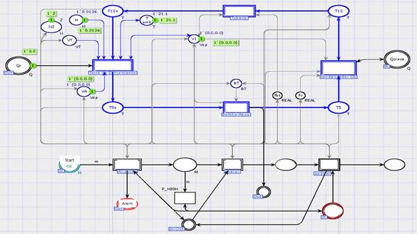 The model is structured as shown in Figure 6, where the upper rectangles to double lines represent the cycle models. The model at the bottom, which is bounded by the Start (“Start”) and System Off (“Systems off”) places, represents the supervisory control model.