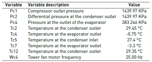 The night mode operates with fixed parameters in the load cycle, compression and evacuation until the required glycol temperature is attained at the evaporator outlet (T7). Then, the glycol mass flow in the load cycle is modified to compensate variations and maintain a stable temperature (T7). In the vapour compression cycle, the compressor inlet pressure (P4) and the coolant temperature at the evaporator outlet (T4) are obtained by manipulating the mass flow of refrigerant through the evaporator. Additionally, the pressure (P2) and temperature (T2) are regulated at the condenser outlet by manipulating the mass flow through the condenser with the compressor. The evacuation cycle is operated by modifying the water mass flow to control the water temperature at the condenser outlet (T12) and modifying the cooling tower fan operating frequency (W4). The water cooling rate is varied at the condenser inlet (T5) to maintain stable heat extraction variations. A summary of the theoretical values for the system variables are shown in Table 3.
