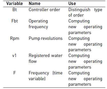 Above the arcs, a series of inscriptions that represent the relations that govern pump operation are observed. In this case, the equations compute the flow delivered by the pump as a function of the frequency operation. The variables in this model are clarified in Table 4.