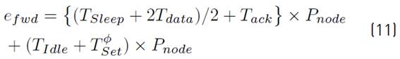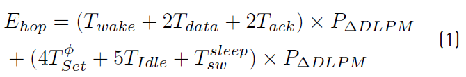 Based on the assumptions made and the timing diagram of Figure 5, the energy budget, Ehop in equation (1), allocated to a single intermediate node (e.g., Hop − 1) on a known path is given by: