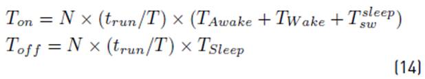 where Ton and Toff are the sum of the active and sleep times, respectively, of all SNs, as shown in equation (14).