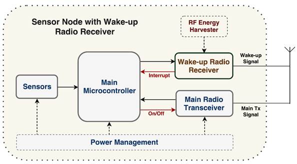 A WuRx is an ultra-low-power radio hardware, which is commonly added to SNs as a second radio, as shown in Figure 1. Some WuR prototypes are detailed in [2]. Typically, a WuRx is periodically listening to the channel for a pre-defined Wake-up Signal (WuS), which activates, through an interrupt signal, other electronic parts of the SNs, for instance, the main micro-controller. The wake-up receiver can be listening for WuS in the same frequency band or at different frequencies of the main radio transceiver. The former is know as in-band channel, and the latter, out-of-band channel [2]. The in-band channel is cheaper because we can use the same main radio