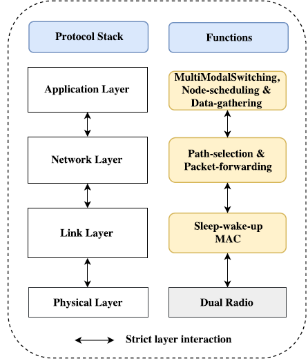 Typically, the wake-up protocol is integrated into the link layer of a layered architecture for M2WSNs [Figure 2], which includes an application layer which runs M2SMs (e.g., eHNS [3]) using the information provided by its adjacent layer. A network layer that performs topology management duties, e.g., path selection, and packet forwarding. A link layer that executes sleep-wakeup duties combined to medium access control with retransmission functions, which aim to minimize the energy consumption at the physical layer by reducing the transmission power while providing a high monitoring quality. In this paper, we focus only on the lower-layers and consider a dual radio communication (main radio and WuRx) at the physical layer, both radios sharing the same channel (in-band solution).