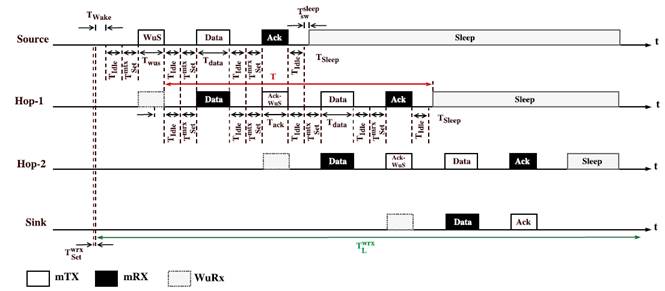 Figure 5 presents the behavior of the proposed wake-up protocol using a WuRx scheme when delivering a data packet to the sink through a known routing path. The diagram shows the packets transmitted using the main radio. In Table 2, we also give a list of variables and their corresponding description, which are used in the diagrams and the later analysis.