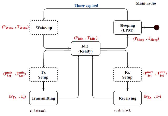 During the active mode, the main radio remains on its Idle state, and switches between Transmitting and Receiving states depending on the task to perform: (1) to transmit a data or Ack packet to the next hop in the routing path or (2) to receive a data or Ack packet from the previous hop (to process it or to relay it). The transitions to set up the main radio are modeled in Tx Setup and Rx Setup states (e.g., data encapsulation), respectively. After performing these tasks, the main radio returns to its Idle state, and then to the Sleeping state, where it remains in the deepest low power mode.