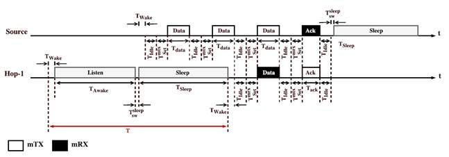 The wake-up protocol operates under a sender-initiated LDC scheme. Every node periodically wakes up to listen to the communication channel, and to determine if there are potential incoming data packets during a TAwake period. If no data packet is detected, the node goes back to LPM and sleeps until its next scheduled wake-up interval (e.g., TSleep), as shown in Figure 7 (i.e., refer to Hop − 1 time line).