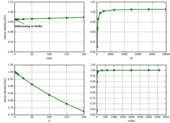The curves in Figure 8 are obtained by varying the same single parameter in both models. Besides, the study is made under the third scenario, where mtbe = 60s andTsleep = 10s. For each parameter value, the power consumption in each model was computed, and the ratio, i.e., power consumption WuRx-based model/power consumption LDC-based model, is shown on the y −axis. Hence, if the ratio is less than one, the power consumption in the WuRx-based model is smaller than the LDC-based model, and vice-versa.