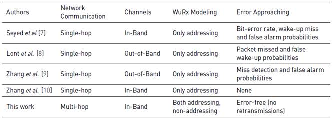 In Table 1, a comparison is made between relevant energy consumption models proposed in the literature and our approach. Most of the work only applies for single-hop MAC protocols and two-channel solutions. Our model takes into account multi-hop communications and the energy budget for the whole network, and the main radio and WuRx use the same channel (in-band-solution), whereby only very few works exist in that area [2]. Finally, our model allows for modeling addressing and non-addressing WuRx compared to other models that focus only on addressing.