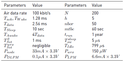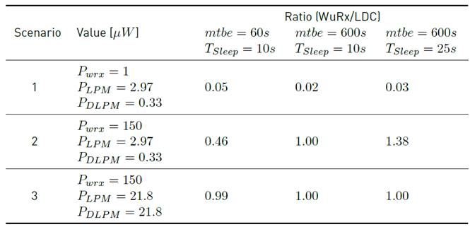 First, we analyzed the impact on the energy consumption when considering different low-power modes supported by the node employing the WuRx, as shown in Table 4. For the first scenario, we considered the classical use case where Pwrx +PDLPM < PLPM , with PDLPM = 0.1μA×3.3. V nine times lower than PLPM = 9 × PDLPM (assuming that all peripherals can be turned off). For this scenario, varying mtbe and TSleep shows that a significant energy budget could be saved when this WuRx protocol is used, i.e., the ratio between WuRx and LDC power consumption ranges from 0.02 to 0.05.