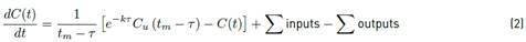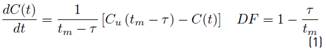 where t represents time [T], Cu(tm - τ) [ML−3] is the upstream concentration entering the reach, C(t) [ML−3] is the output concentration at the downstream boundary [ML−3], tm [T] is the mean travel time and τ [T] is the lag time or first arrival time (travel time) and DF [dimensionless] is the dispersive fraction. The travel time tm and the lag time τ are easily measured in the field using curves by performing tracer experiments.