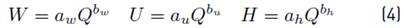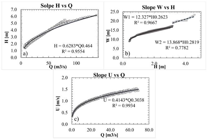 where ai and bi are constant and depend on the morphological and hydraulic characteristics and the subscripts w, h and u refer to the width, depth, and average speed, respectively.