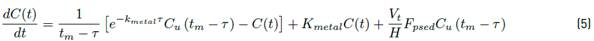 whereKmetal [T-1] is the degradation constant of each specific metal and is obtained from the Equation (6), H [L] represents the average depth of the characteristic section of the reach, Vt [LT-1] represents the average speed of the section and Fpsed [dimensionless] is the suspended fraction of each base metal calculated from the partition coefficient of the sediment layer proposed in [23], according to Equation (7).