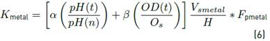 where pH(t) represents the pH value and pH(n) the neutral pH value, DO(t) [ML-3] is the dissolved oxygen value and Os [ML-3] is the saturation dissolved oxygen value, and Vsmetal is the sedimentation rate of each constituent specie (chromium, copper, and nickel for this case).