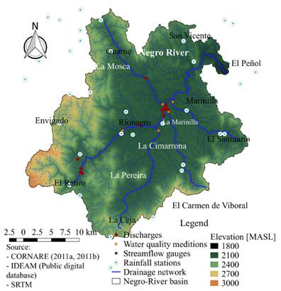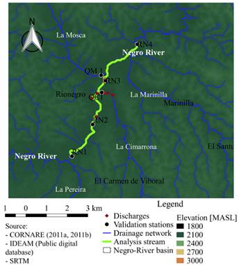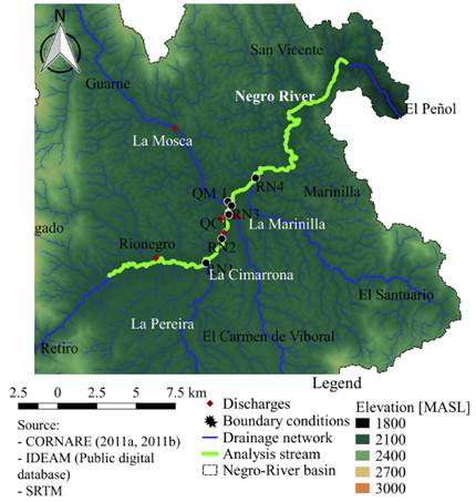 The study area is located in the department of Antioquia, Colombia, within the Negro river basin, which has an area of 5924.83 Km2, made up of the municipalities of Guarne, San Vicente de Ferrer, Rionegro, El Carmen de Viboral, La Ceja, Marinilla, El Peñol and Envigado. The Negro river headwater is located to the south of the region, on the eastern side of Las Palmas mountain range, in Cerro Pantanillo (municipality of El Retiro) at 3000 m.a.s.l. By the municipality of El Peñol, it is called the Nare river, and receives Pantanillo, La Pereira, La Mosca, La Marinilla, La Cimarrona and La Compañía streams [10].