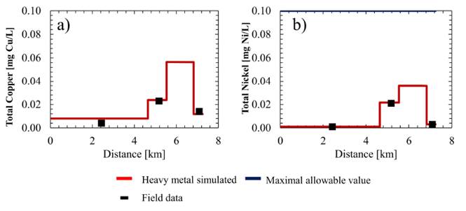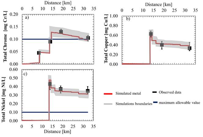Figure 10a presents the modeling of total chromium. The chromium simulation includes modeling of the hexavalent and trivalent species in a separate way because each of these has a characteristic behavior in the streams and different kinetics dynamics [23, 34]. However, since the records by [13] present information of total chromium, the result of this modeling is presented as the sum of the hexavalent and trivalent chromium species in Figure 9a. Figure 10b and Figure 10c present the modeling for copper and nickel, respectively.