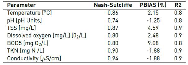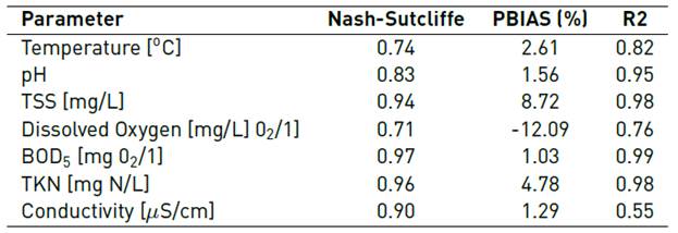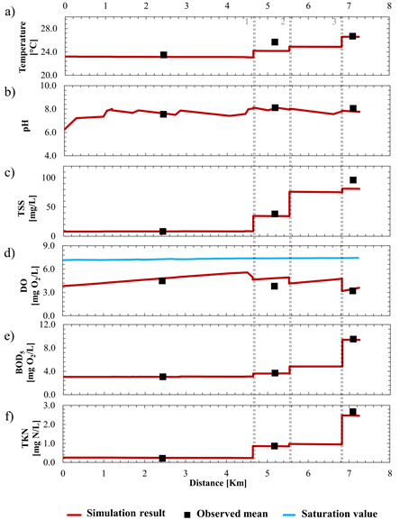 Figure 9 shows the results for temperature, pH, TSS and dissolved oxygen. The BOD and Nitrogen as TKN model results are also shown, which strongly influence the behavior of dissolved oxygen (because they are directly related to oxygen consumption and, therefore, to its dynamics in streams behavior).