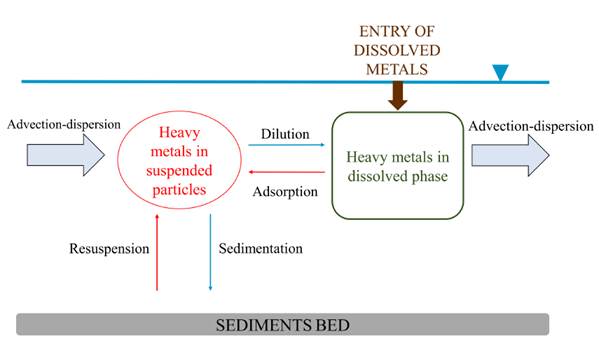 Modeling heavy metals is a task that requires considering a significant number of interactions. For instance, reactions with different constituents of the suspension matrix, the dissolved matrix, and the sediment bed, provide an intricate series of possible reactions that turn the task into a complex modeling exercise. Figure 2 shows the conceptual model for heavy metals behavior.