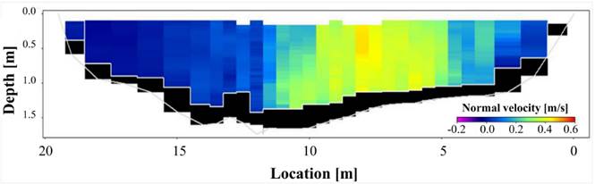 The equipment used to measure flow parameters in the cross-sectional area of the RN1 station was a river surveyor M9 which is an Acoustic Doppler Current Profiler (ADCP). Figure 5 presents the gauge selected at the RN1 station, where the bathymetry of the wet area section estimated from the ADCP path can be observed. The estimated flow rate for the section at the RN1 station was 3.8 m3/s; which represents the flow rate from which the loads for the boundary and the following conditions were calculated.