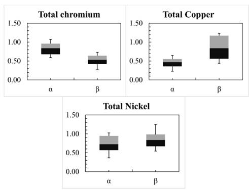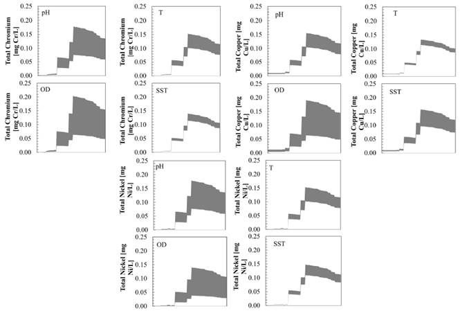 Results shown in Figure 10 refer to an exercise of 10000 simulations, where the gray region includes all the possible results of simulations and the red line represents the better adjusted simulation to the obtained values. The overestimation observed in the copper values and the underestimation of the total chromium and nickel values can not only be associated to the adjustment of the model, but also to the quality of the data used to calibrate the model. That is, the sampling exercise did not follow a strategy of travel times and the data corresponds to a set of samples taken at different times between the years 2003-2008. Although the model simulation shows overestimation and underestimation, it is observed that the red line (simulated metal) is located along the width of the boxplot (observed data), for the three heavy metals considered.