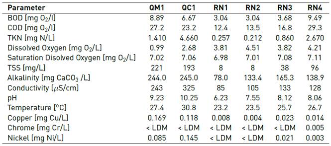 The results of dissolved oxygen, BOD5, COD and TKN presented in Table 2 show a significant degree of contamination, which lowers dissolved oxygen to values close to zero for tributary streams of the Negro river (La Mosca and Cimarrona Streams). These streams are the most affected by discharges of industrial effluents.