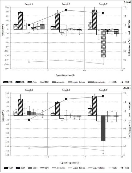 According to Figure 3, in general, there was an increase in colour after the treatment, except when sample 1 was used. In this case, there were removals of 28 and 32% in lagoons AL(A) and AL(B), respectively. Still, in both systems, the increase in colour was inferior to other ALs, in which colour increased 90% in HRT of 28 days [27]. This has been related to the polycondensation-adsorption of lignin structures, which would occur simultaneously with a mechanism of filterable colour formation due to the biochemical oxidation of some functional groups of lignin [28]. Other authors have argued that, during treatment, the organic matter that is not removed through biodegradation can be modified for chromophoric units instead of mineralized and, consequently, leads to an increase in the level of colour [29, 20].