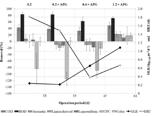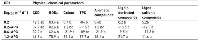 The best performance of AL-APG was observed for the OLR 1.2 kgCODm-3d-1 with APG. The COD and BOD5 removals were, on average, 50% and 75%, respectively and the removal of lignin derived compounds and total phenolic compounds was verified for this organic load rate, corroborating with were observed in others biological treatment of moving bed in similar OLR.