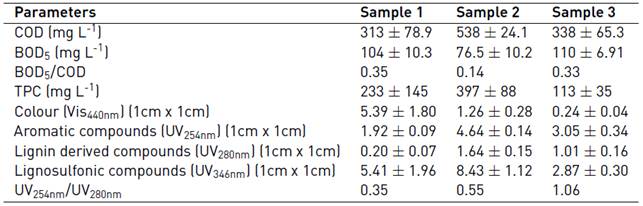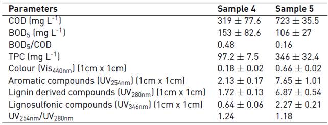 Sample 5 showed a lower BOD5/COD ratio (0.16), with high concentrations of TPC (>340 mg L-1), colour and compounds derived from lignin, having more recalcitrant features.