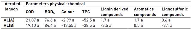 Sample 4 showed a good BOD5/COD ratio (>0.3) for the biological treatment by aerated lagoon and low TPC concentration (<100 mg L-1). In addition, it had low colour and high content of aromatic compounds as well as other pulp and paper effluents [19].