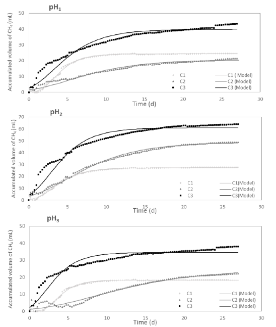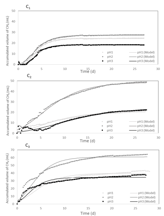 The comparison of experimental and predicted cumulative biogas production using the modified Gompertz model for each C/N ratio is shown in Figure 1. According to the results, the highest values of methane production were reached with pH2 reaching values of 27.3, 49.0 and 61.0 mL CH4 for C1, C2 and C3, respectively. Furthermore, the effect of pH on the methane production for C1 was not as strong as on C2 and C3 due to C1 is the ratio to which the treatment plant works. For C1, the methane production achieved with pH2 was 49% and 12% higher than those reached with pH3 and pH1, respectively. Conversely, the C2pH2 combination obtained methane production 98% and 238% higher than with pH3 and pH1, respectively. However, for C1, the lowest methane yields were obtained.
