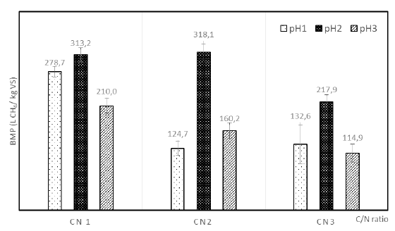 The biochemical methane potential (BMP) test is the definition of the methane (or biogas) produced from a given weight of a certain substrate [27] and this has been used to determinate the energy efficiency of different wastes or substrates. Figure 3 shows the BMP results for each C/N ratio and pH evaluated.