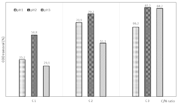 Figure 3 shows that for pH1 and pH3 the BMP value obtained was lower than for pH2 for all C/N ratios. The maximum BMP value was 318.1 L CH4 /kg VSS with initial pH2 and C2, with a COD removal of 79.2%, is a viable option to improve the anaerobic treatment. Furthermore, although the maximum methane production was presented for the C3pH2 condition (61 mL CH4), the BMP in this condition (217.9 L CH4 /kg VSS) was lower than the other C/N ratios. However, the COD removal was higher (85.2%) than other conditions as can be seen in Figure 4. This behavior is due to the carbon source used as co-substrate to rise the C/N ratio of the reactors since the use of aerobic sludge increased the VS content. For C3, the VS was 1.99 g/L while for C1 and C2 were 0.58 g/L and 1.08g/L, respectively, therefore the BMP value decreased causing the substrate loses energy efficiency [28].