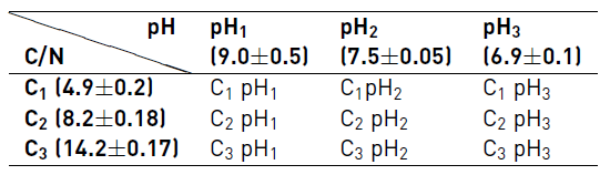 To evaluate the influence of the pH and C/N ratio on the biochemical methane potential a 32 factorial design was used. C/N ratio used were 4.9 (C1), 8.2 (C2) and 14.2 (C3) and pH values were 9.0 (pH1), 7.5 (pH2) and 6.9 (pH3) units. C1 and pH1 are the operating conditions of the wastewater treatment plant at UPB. C/N ratio was changed with the co-substrate addition, simulating the aerobic sludge recirculation to the anaerobic reactor, and the pH with hydrochloric acid 0.1N. Table 1 shows the operating conditions used.