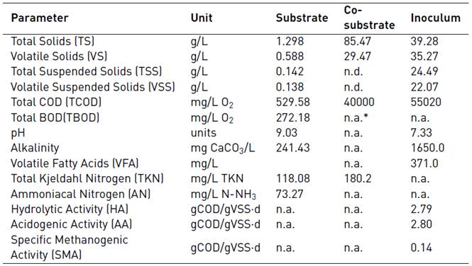 The chemical characterization of substrate, co-substrate and inoculum is shown in Table 2. The pH value in the substrate was 9.03 units which is related to high urea content and the use of alkaline detergents in the institution. High values of pH cause instability of anaerobic digestion due to the rapid conversion rate of ionized ammonia nitrogen into free ammonia nitrogen. For limiting the inhibitory effect of free ammonia nitrogen on the anaerobic digestion process, it is suggested to keep the pH values close to 7 [6].