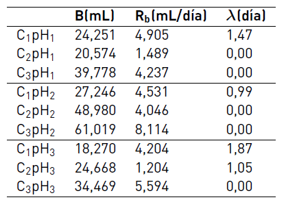 Table 3 shows the kinetic parameters obtained with the Gompertz model. The pH has a direct influence on the methane production potential (B) and the maximum methane production rate (Rb). It was found that the value of Rb obtained at pH2 was higher than the value obtained at pH1 and pH3. These results are in agreement with other authors who report that the optimal pH for methanogenesis is around 7.0 [7]. When the pH is high, the ionized ammonia nitrogen can be converted in free ammonia nitrogen and inhibiting the methanogenesis [6].