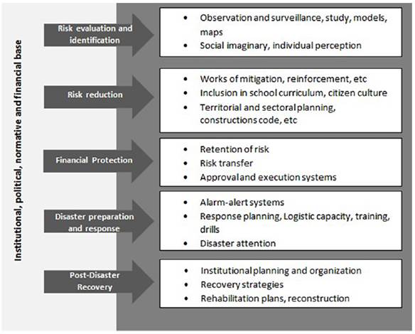 Similarly, the risk is defined as "the combination of the probability of an event to occur and its negative consequences" [14]. Natural disasters and the consequent social, environmental and economic losses have led to the creation of risk management, which refers to social actions and processes aimed at minimizing the negative consequences of disasters, including post-disaster activities, like the rehabilitation and reconstruction of the territory. Risk management incorporates five main components: 1) the identification and evaluation of risk; 2) risk reduction; 3) financial protection; 4) preparedness and response to disasters, and 5) recovery after a disaster. The fourth component includes EWS [Figure 2] [15, 16].