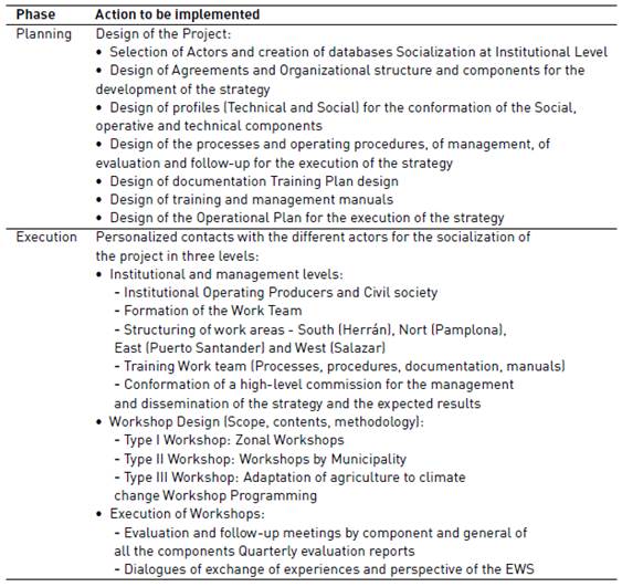 The early warning system for extreme weather events present in the Department of Norte de Santander, uses the data of precipitation, dew point, wind speed, direction, pressure and temperature, thrown by meteorological stations, to predict a behavior and issue alerts that reduce the vulnerability of the risk in the region. The project was formulated considering two main phases: the first phase of Planning and the second phase of Execution, each one of the phases is designed according to the actions to be implemented and the expected products as shown in Table 1.