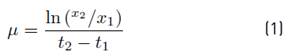 The specific growth rate is determined using equation (1) Where x1 and x2 are cellular concentrations at times t1 and t2: