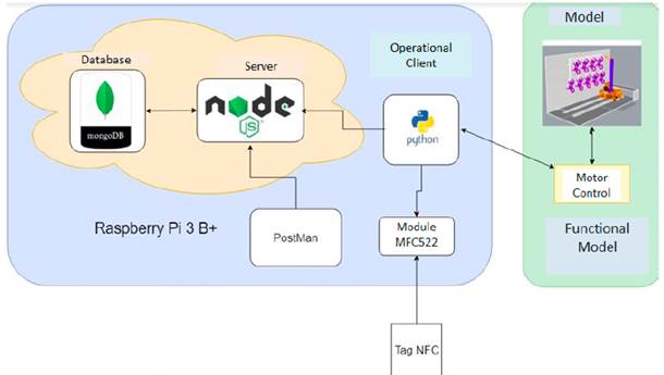 The main objective is to use the technologies (NFC, Databases, servers) to solve a problem in the parking cycle (theft, identification, storage, organization, etc.), implementing a system of bicycles parking, creating a method of entry and storage in a smart parking where, through requests sent to a server Node, available spaces are obtained so that a bicycle can be stored. Figure 10 shows the communication between the client and the parking lot cycle by NFC technology, using NFC tags where each tag brings an UID and all the user-based information. A Raspberry is in charge of the control of mechanical movement (Motors, drivers, sensors, etc.). The communication between Raspberry and the server is mediated by http requests to create, complete and verify the registration of each user and each storage.
