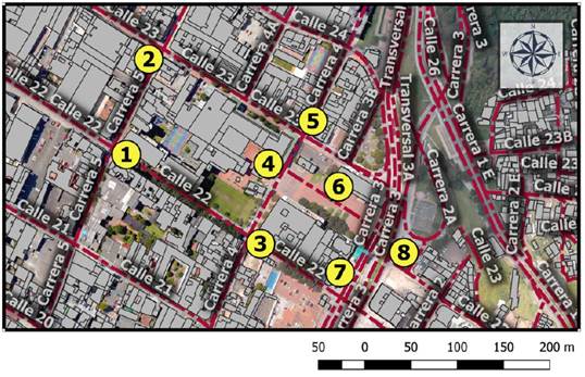 A distance less than 250 meter, between points, was chosen to do the measurements. The mesh goal was to cover noise hot spots in the study area, which generally coincide with streets intersections or agglomeration for this case. In Figure 4, the grid used to do the measurements can be seen. Here, spots 4 and 6 correspond to Jorge Tadeo University entrance and main square, respectively. The other ones registered the noise behavior in some principal streets that surround the university.